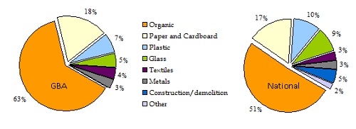 أما المصادر الرئيسية للنفايات فهي المنازل، المؤسسات التجارية وأسواق الخضار والأسماك، وعمليات تنظيف الطرقات وتشذيب الحدائق العامة. تشكل النفايات العضوية المكون الأكبر من مجموع النفايات الصلبة البلدية حيث تعادل نسبتها حوالي 63% من اجمالي كميات النفايات الصلبة في بيروت الكبرى وحوالي 51% من الإجمالي العام الوطني كما هو مبين في الشكل ادناه.